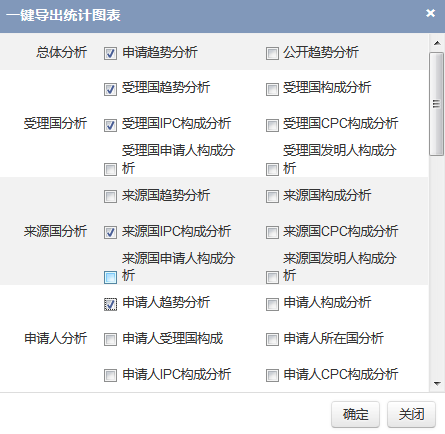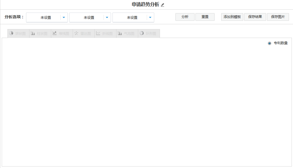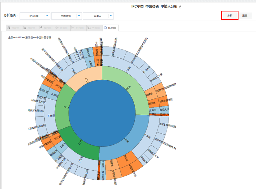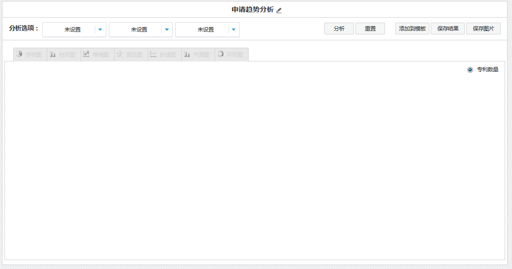 当进行一维分析时,仅设置“第一分析选项”字段即可。分析图表以该字段内容为横轴,以专利统计数量为纵轴。当进行二维分析时,需同时设置“第一分析选项”字段和“第二分析选项”字段。分析图表以“第一分析选项”字段内容为横轴,以“第二分析选项”字段为图例,以专利统计数量为纵轴。当进行三维统计分析时。需同时设置“第一分析选项”字段、“第二分析选项”和“第三分析选项”字段。分析图表以环形图的形式加以呈现,具体见“4 如何生成三维分析图表”。