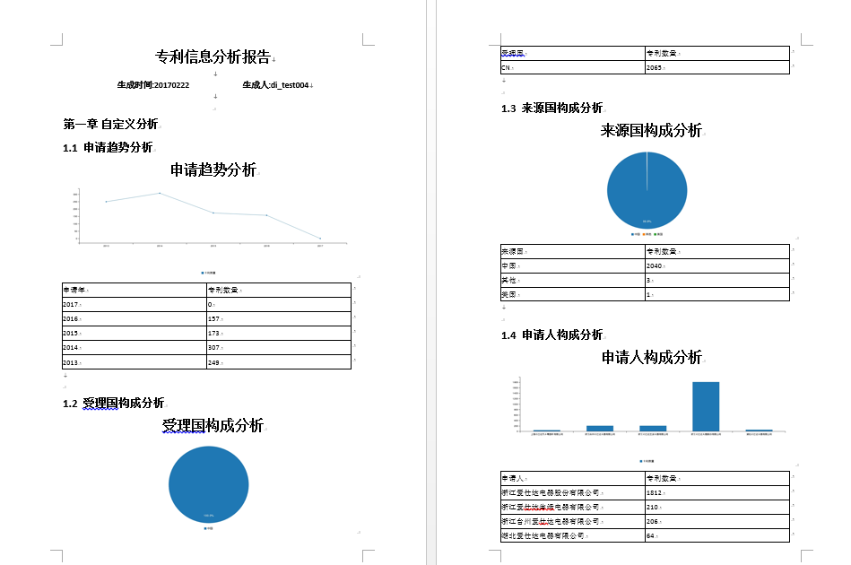 后分析报告会以word的形式下载到本地电脑中,打开后可以看到里面的内容是根据选择的分析名称生成的一个专利分析报告。