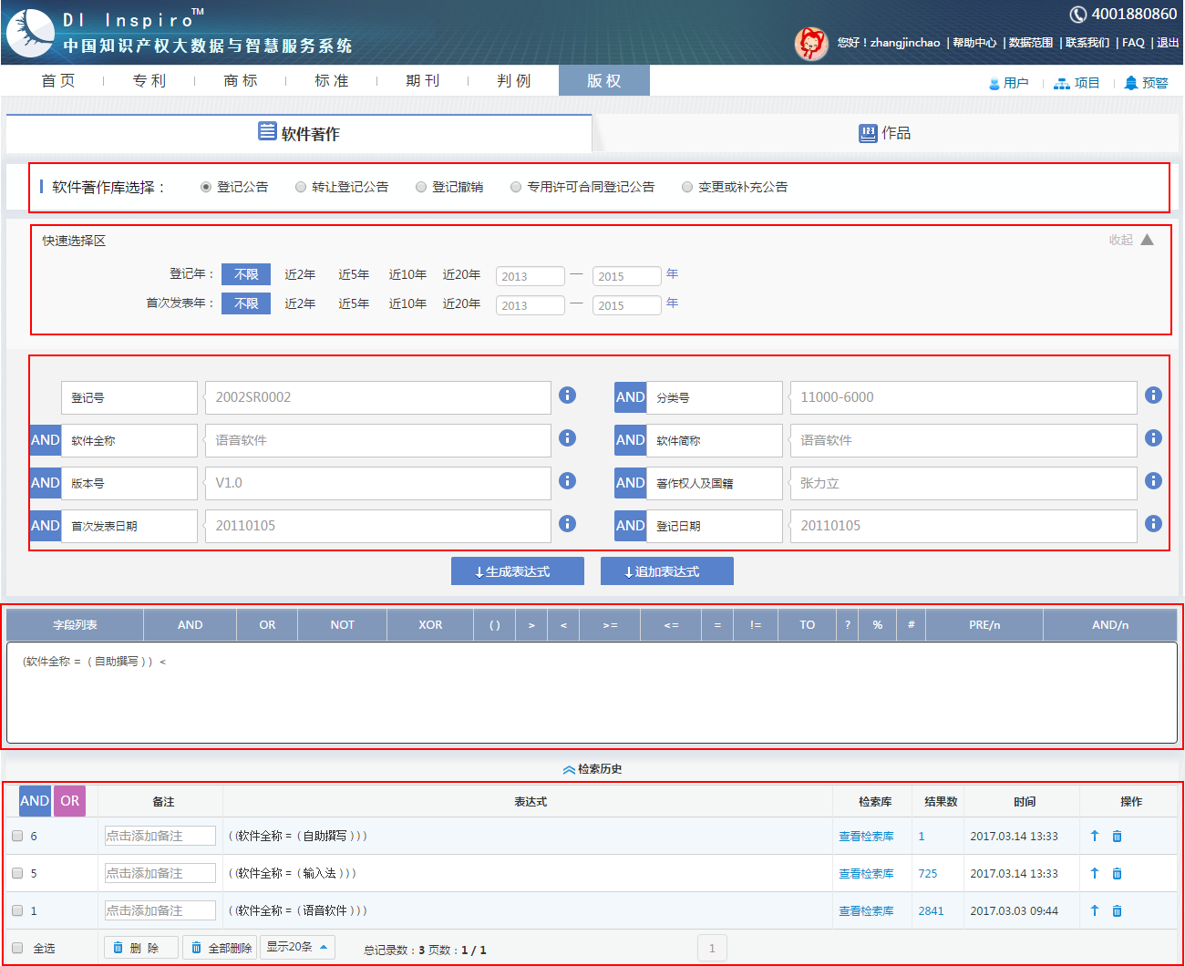 用户在表达式编辑区可利用系统提供的检索字段(字段列表)及检索运算符(17种)对生成的表达式进行修改,或手动编辑检索表达式,检索历史用于记录用户的检索行为。