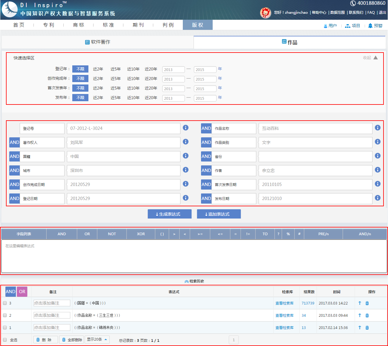 作品著作权检索页面从上至下依次为快速选择区、表格检索区、表达式编辑区和检索历史显示区,各区域的功能与专利表格检索类似。