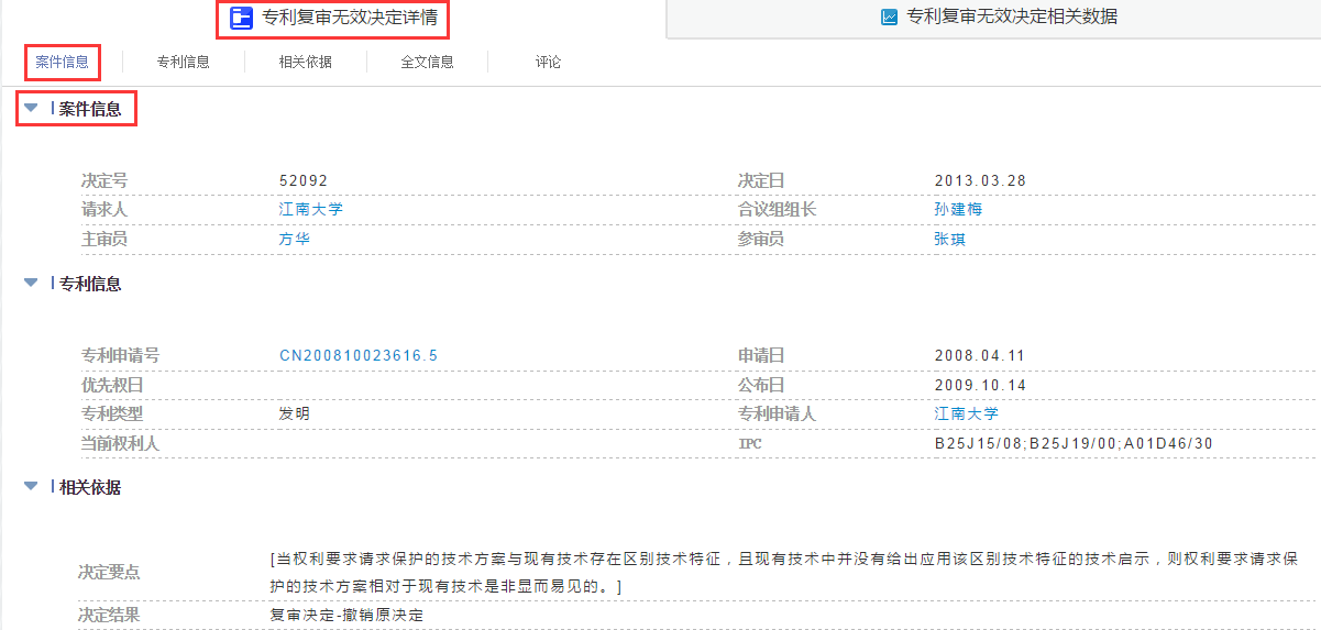 点击专利申请号,系统以检索表达式申请号='CN200810023616.5'进行检索,进入专利概览页面;点击其他蓝色字体,系统以专利申请人、请求人、合议组组长、主审员、参审员字段在复审无效决定数据库中检索,并打开一个新的概览页面。