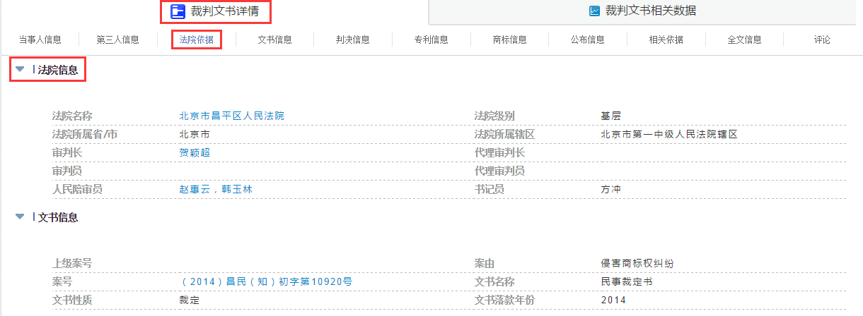 点击蓝色字体,系统将以相应检索字段在裁判文书数据库中检索,并打开一个新的概览页面。