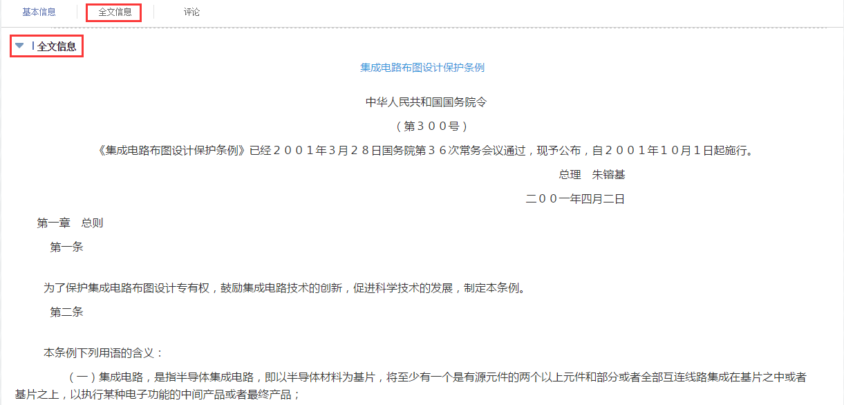 知识产权法律法规详情页面提供发文字号、发布日期、法规级别等基本信息和全文信息,用户可在评论区发表评论。
