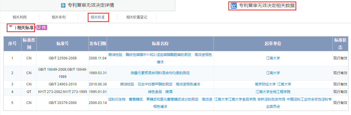 点击决定号、专利申请号、专利公布号、案件发文号、标准及专利名称,进入相应数据的细览页面;点击其他蓝色字体,系统以相应的检索式进行重新检索,检索结果显示在新的页面中。