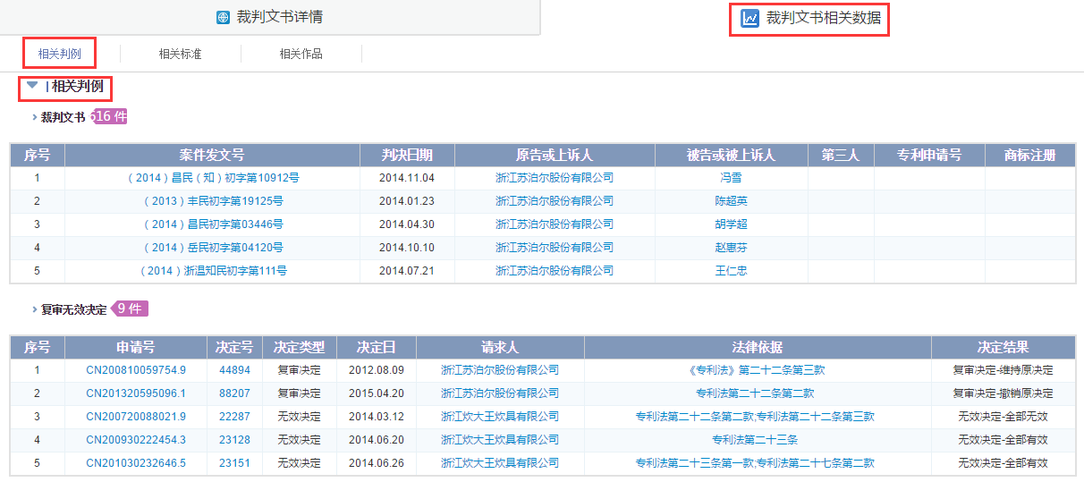 点击案件名称或法律名称即可进入相应细览页面,专利复审无效决定及知识产权裁判文书细览页面由2个页面构成:案件详情页面、相关数据页面,知识产权法律法规没有关联数据,细览页面即为详细页面