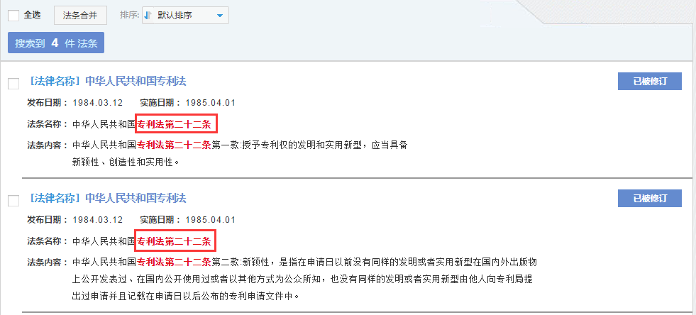 以法律依据专利法第二十二条为例,检索表达式为法条名称 = '专利法第二十二条',检索结果如下图所示。