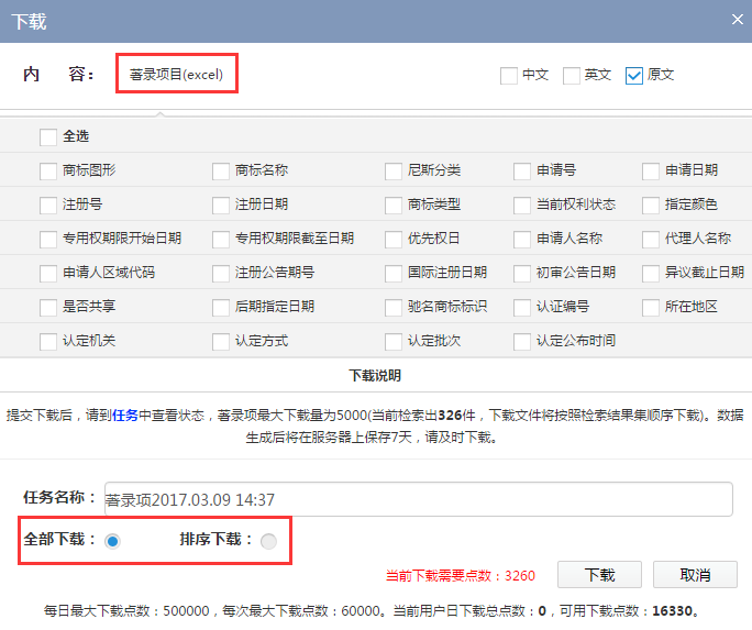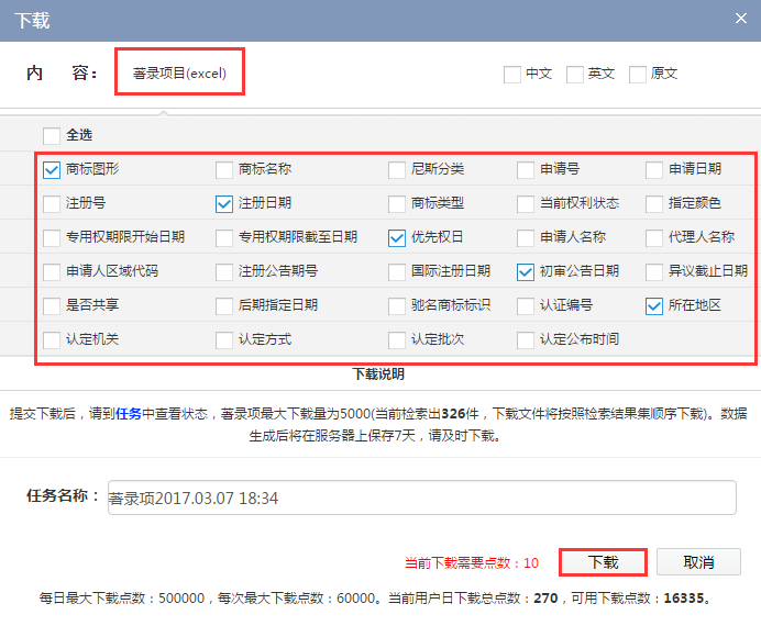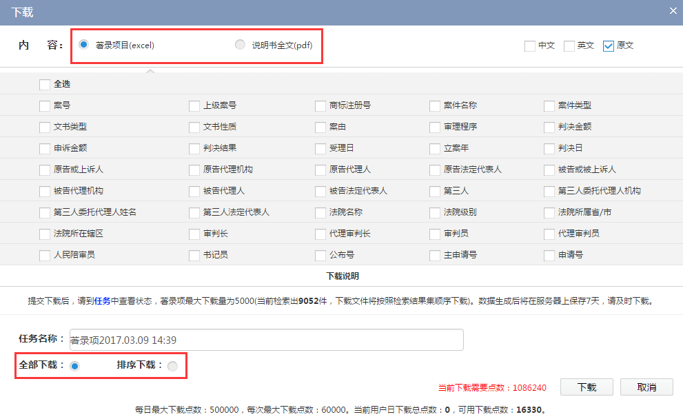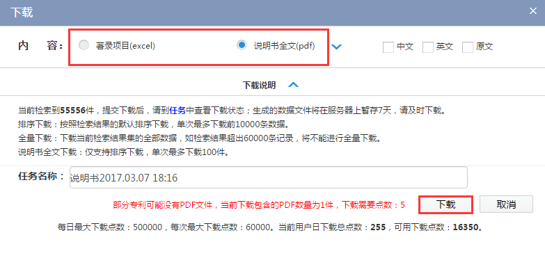,在弹出的下载框中选择下载内容——著录事项或说明书全文,商标、标准、期刊、专利复审无效决定只有著录事项。
