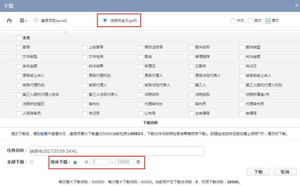 选择下载方式——全量下载或排序下载,全文批量下载仅支持排序下载,单次最多下载100件专利或知识产权裁判文书。
