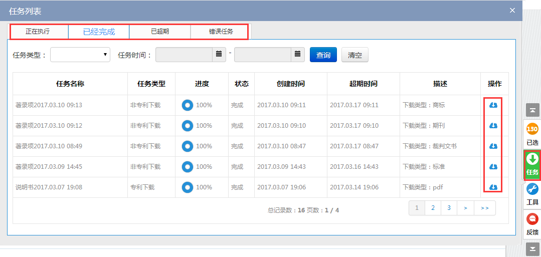 下载任务提交成功后,用户可在页面右侧工具栏“任务”中查看下载进度,下载任务的状态分为正在执行、已经完成、已超期和错误任务,下载完成的数据将在服务器上保存7天,用户需及时点击“已经完成”项下相应任务右侧