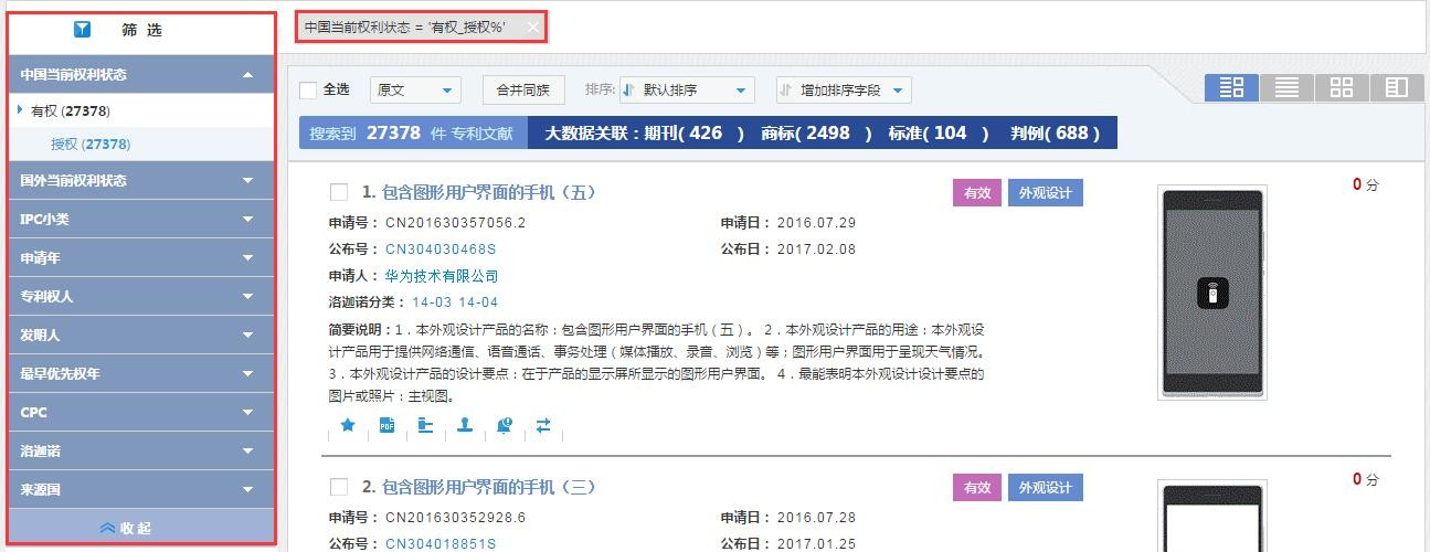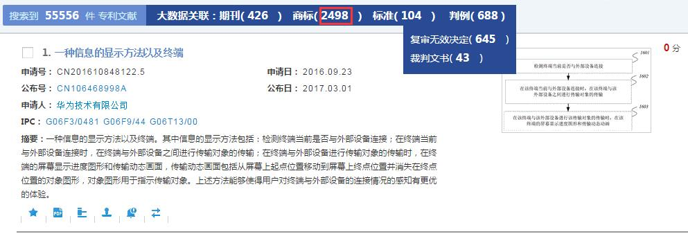 用户在阅览检索结果时,可获取专利、商标、标准、科技期刊、法律文书数据的关联信息。以检索华为公司申请的专利为例,申请人字段输入华为技术有限公司,检索得到55556篇专利文献,智能关联426篇科技期刊,2498件商标,104项标准及688个判例,关联数据按照下列检索表达式分别在相应的数据库中检索所得,点击相应数据可查看详情。