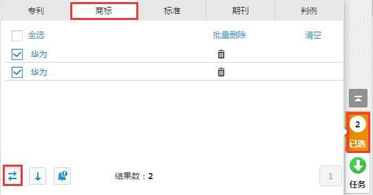 专利、商标、标准、期刊及判例数据库支持2个同类检索文件的对比分析,以商标检索为例,用户可根据需求任意勾选检索结果中的2个商标文件,点击