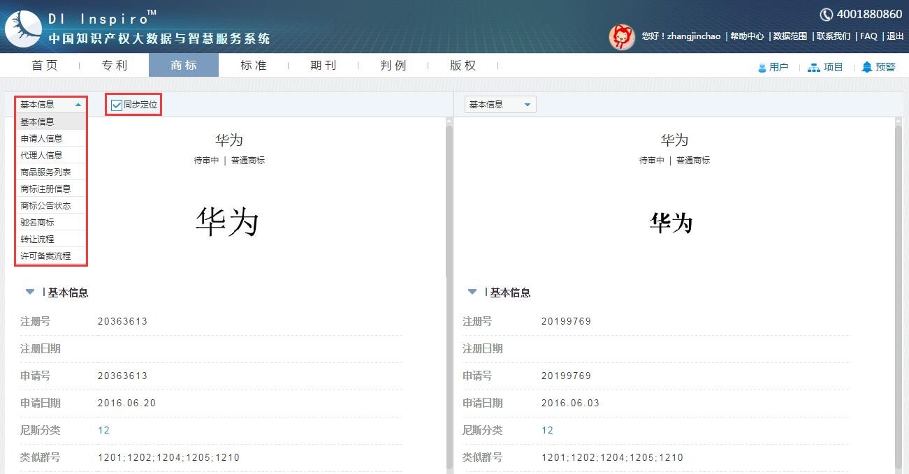 跳转至双栏浏览模式,已选商标将从基本信息、申请人信息等方面进行对比分析。勾选同步定位,在下拉框中选择对比内容,2个商标文件的浏览窗口将同步滑动至对比内容位置。