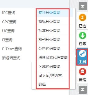 用户在概览页面可通过右侧工具栏“工具”项查询IPC分类、尼斯分类等,以进一步分析检索结果,调整检索策略。此外,Inspiro还提供翻译助手,支持中英、中日、中韩互译。