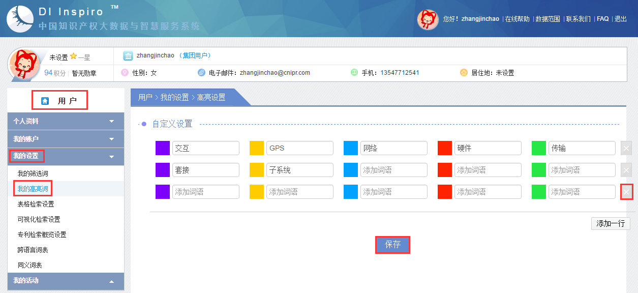 在“用户-我的设置-我的高亮词”中也可以自定义设置高亮词,点击