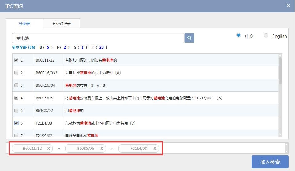 在上述检索模式下,点击相应检索字段输入框右侧 ,可在弹出的查询列表中输入检索词进行查询。以检索字段IPC为例,勾选与检索词相关的IPC分类号,并将其加入检索,IPC分类号之间默认OR关系。
