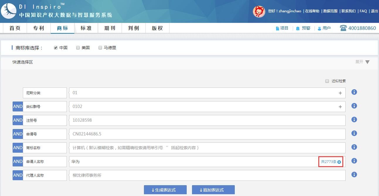 以检索华为申请的商标为例,申请人名称字段输入“华为”,输入框右侧显示2773条商标数据。