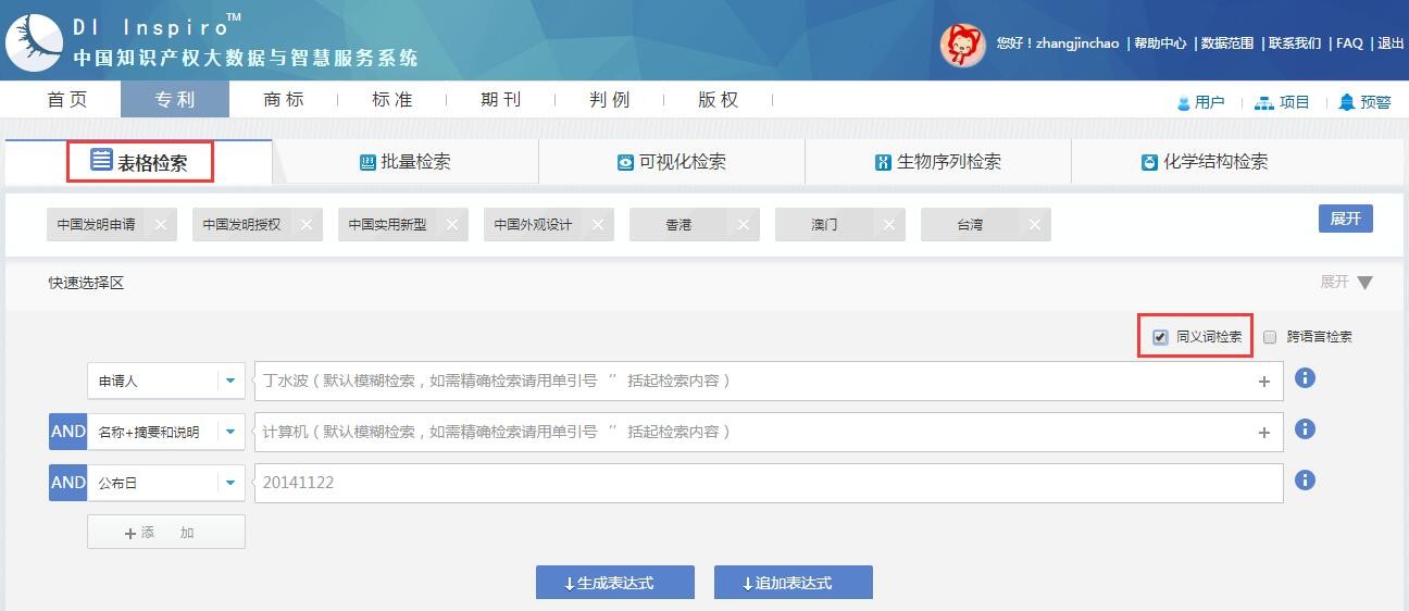 为了防止漏检,用户在表格检索模式下检索相关专利时,可勾选同义词检索,使用检索词的同义词、近义词共同检索。同义词检索适用于名称、摘要、权利要求书、说明书、关键词等文本类检索字段。