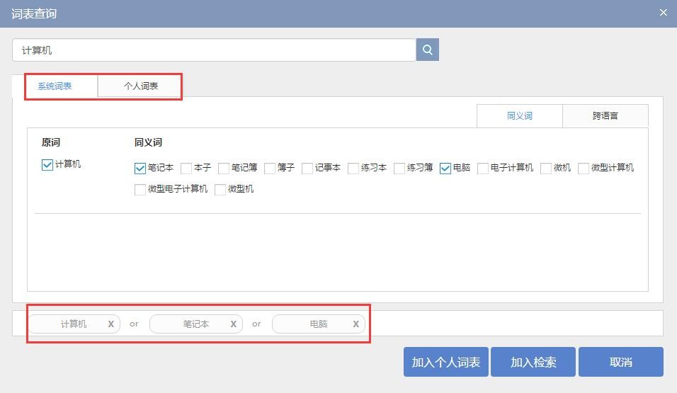 ,可在弹出的词表查询界面中搜索检索词的同义词,并将其加入检索,检索词与同义词之间默认OR关系。