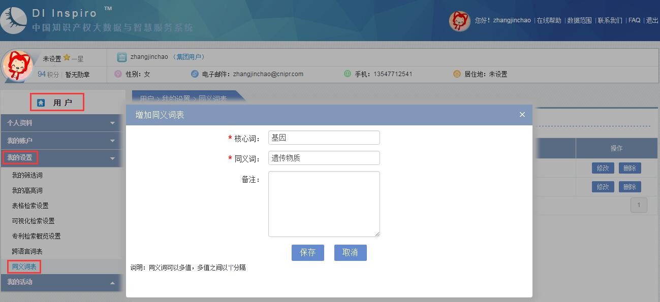 ②在“用户—我的设置—同义词表”中新建个人词表。