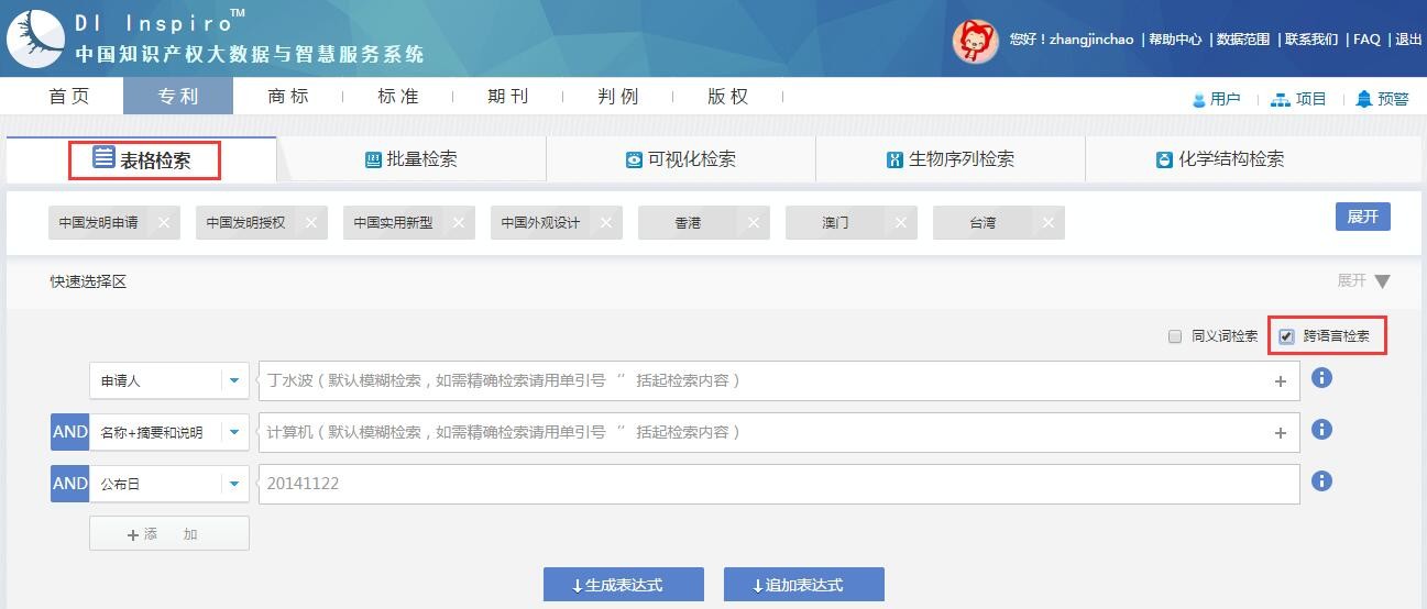 跨语言检索能够实现检索词的中英文扩展,帮助用户了解相关技术的国内外专利申请及授权情况,可在表格检索模式下勾选使用。