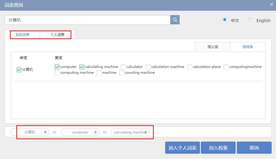 ,可在系统词表或个人词表中搜索、选择检索词的中英文,并将其加入检索,中英文检索词之间默认OR关系。