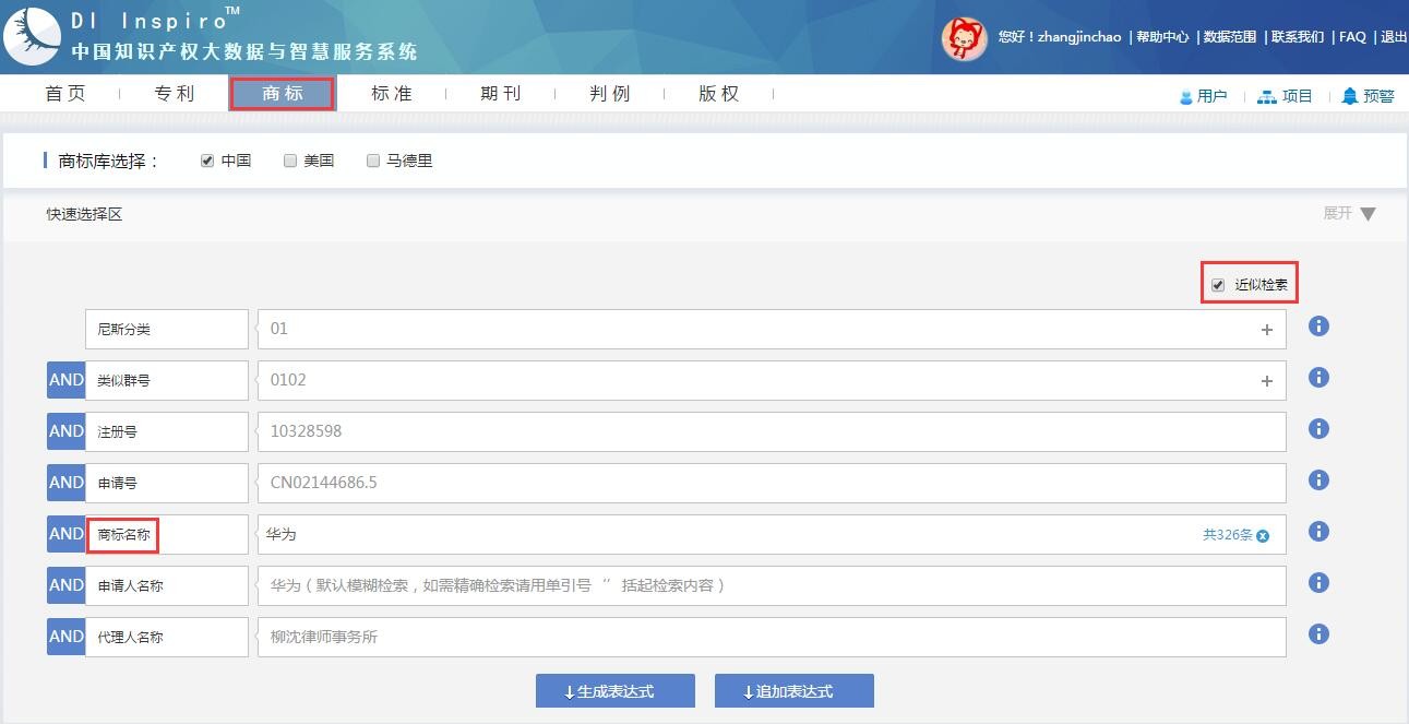在商标检索模式下,可勾选近似检索,近似检索为检索与商标名称近似的商标数据,因此仅适用于商标名称检索字段。