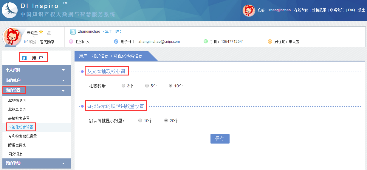 可视化检索利用文本挖掘技术抽取技术术语,可视化联想相关关键词、IPC分类号及主要申请人,用户在“用户-我的设置-可视化检索设置”中可设置文本抽取核心词数量及每批显示的联想词数量,点击