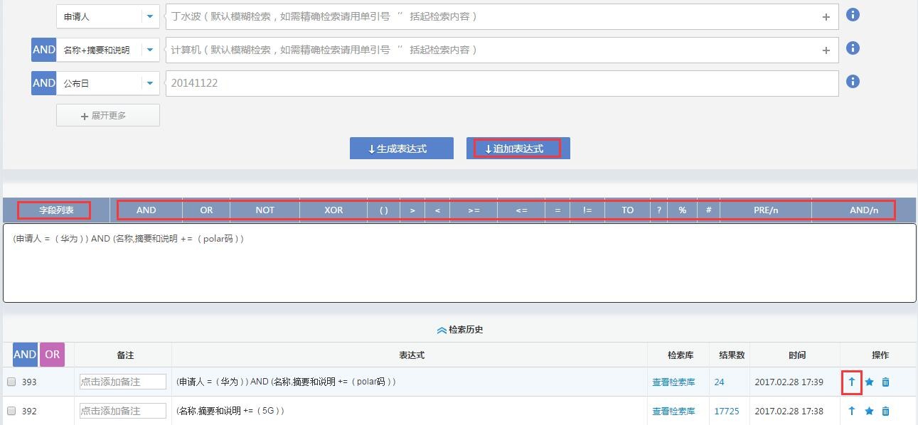 ,可将检索历史中的表达式重新加入编辑区进行编辑。