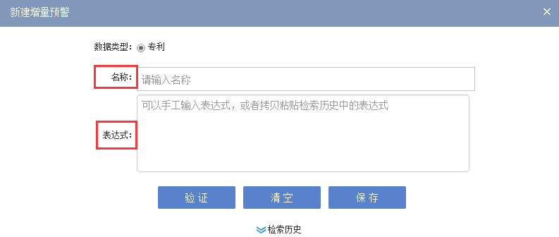 ,在弹出的编辑框中输入预警名称,增量预警表达式默认为此时的检索表达式,无法编辑。