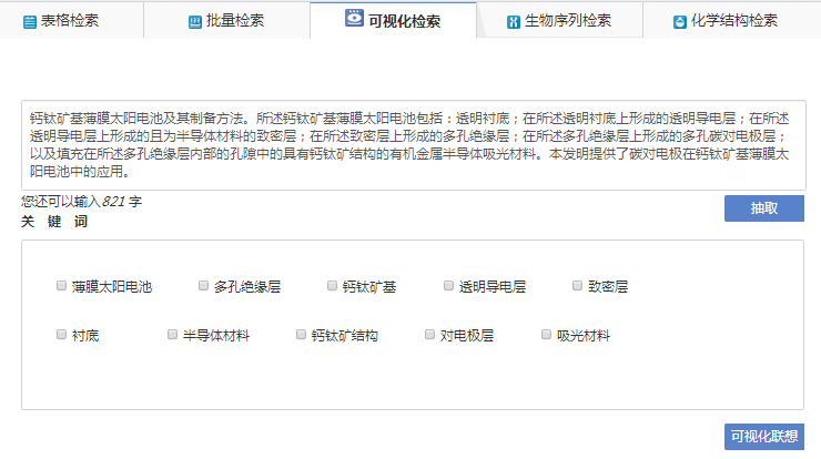 2)在可视化检索页面的技术内容输入框内,输入最多1000字的英文或者中文技术说明;
