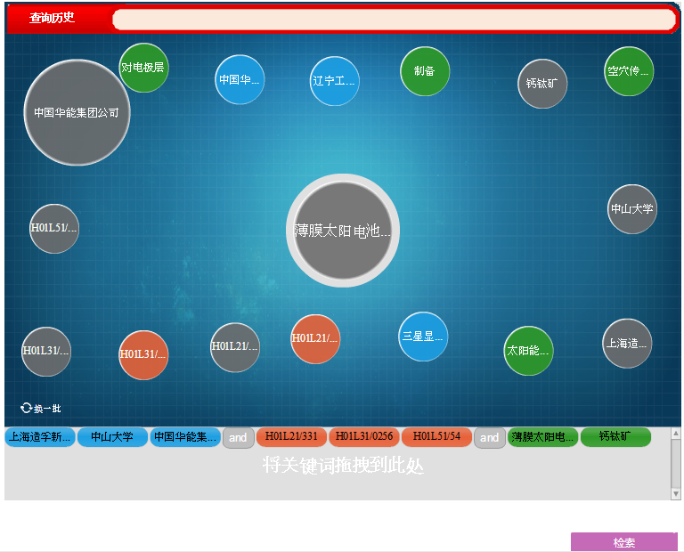 4)勾选抽取出的关键词,点击“可视化联想”按钮,在可视化联想显示框中显示根据勾选内容进行联想的关键词、IPC分类号和主要申请人,并用不同颜色划分不同的数据类型,用圆圈的大小代表相关程度,用户可以选择“换一批”来查看所有的联想内容;