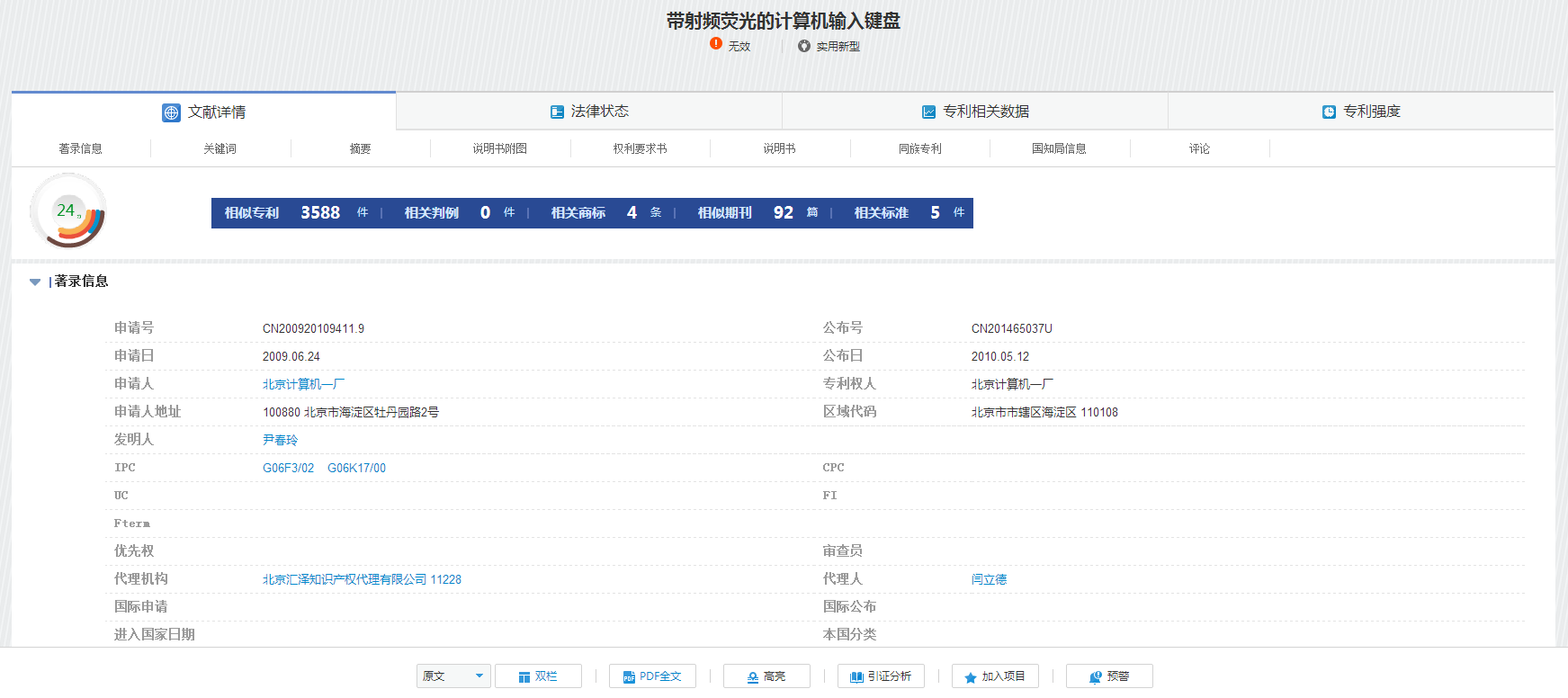 在细览页面中,用户可以查阅该专利的原文、相关著录项等信息,并进行对其分析与管理。细览界面提供四种主要的信息详览界面,包括