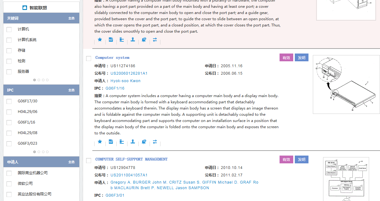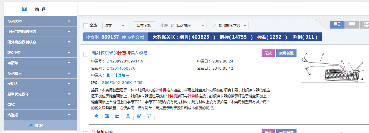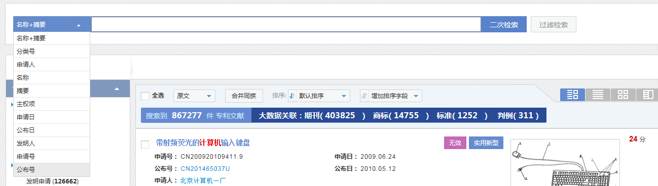 按钮,将会把关键词出现在名称、摘要和主权项中、同时属于相应的IPC和申请人作为筛选条件得到检索结果。