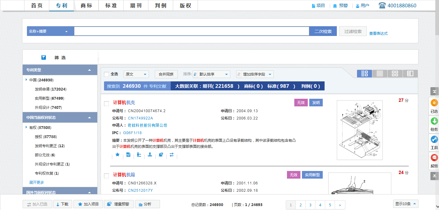 筛选工具栏:对检索结果依国别、专利类型、权利状态、IPC分类等10个字段进行筛选