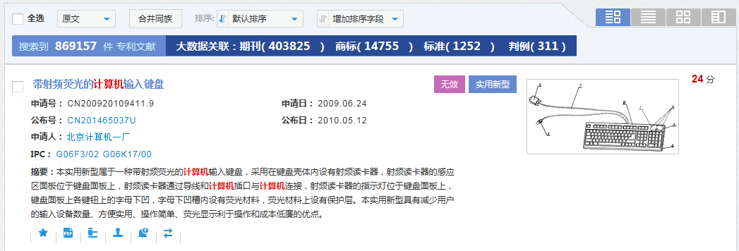 Inspiro在检索概览模式下提供多种方式和工具帮助用户浏览、处理检索到的结果。举例来说,在图文概览模式下,检索结果页面会呈现出检索结果专利的名称、申请号、公布号、申请人、申请日、公布日、IPC分类、摘要、专利类型、法律装填、评分与附图信息。以下图中的检索结果为例: