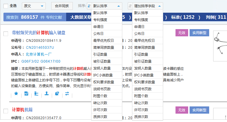 关联栏显示了专利检索命中结果的数量以及其大数据关联的数目。用户可以根据大数据关联的结果进行调整检索条件,也可以根据大数据关联的结果丰富分析思路。点击相应内容后面的数量,可以直接查看相应内容的相关结果。