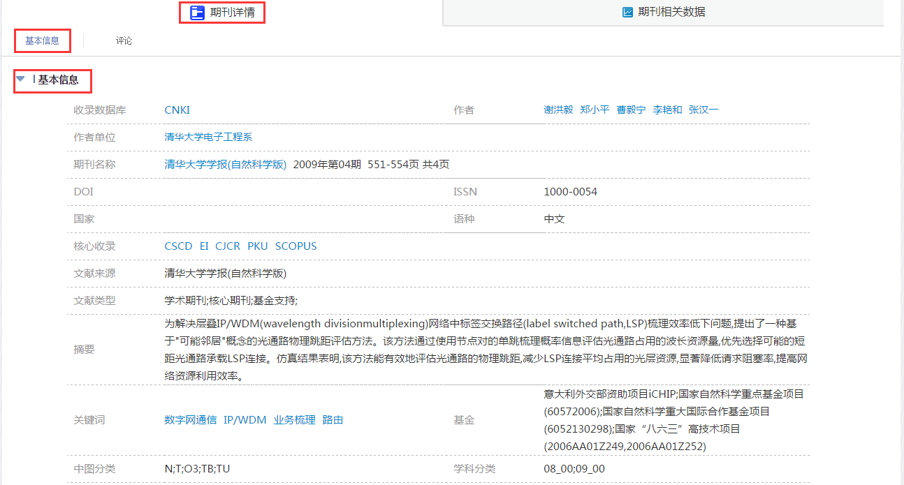 以通过作者单位,检索表达式作者单位=清华大学检索得到的文章——《IP/WDM网络中基于光通路物理跳距评估的业务梳理》为例,相关数据按照下列检索表达式分别在相应的数据库中检索所得。