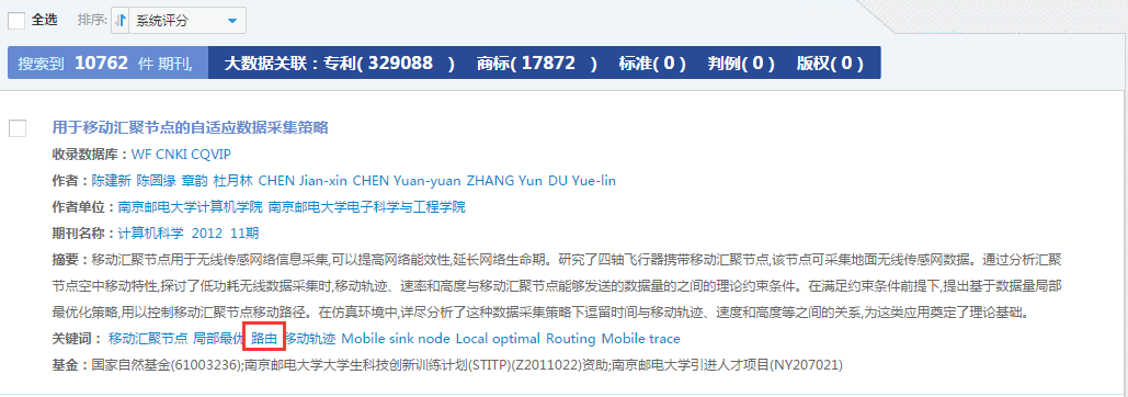 点击文章、专利或标准名称,进入相应数据的细览页面;点击其他蓝色字体,系统以相应的检索式进行重新检索,检索结果显示在新的页面中。