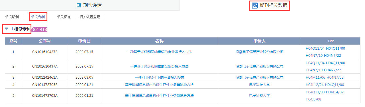 期刊相关数据页面提供相似期刊、专利,相关商标、标准及版权信息,用户点击期刊详情页面关联数据也可跳转至该页面。点击页面上部相关数据列表即可滑动至相应位置。