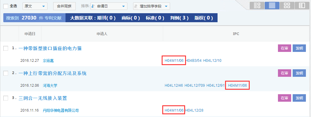 以IPC分类号H04M11/06为例,检索表达式为IPC = 'H04M11/06',检索结果如下图所示。