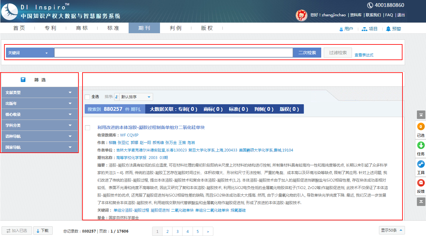 或检索历史中的结果数,跳转至期刊概览页面,期刊概览页面可分为检索区、筛选区、阅览区和工具栏4个部分。