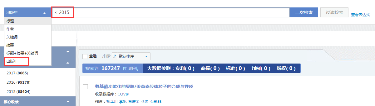 二次检索、过滤检索是在当前的检索结果中再进行一次检索,二次检索默认两次检索的检索词之间为AND关系,过滤检索默认NOT关系。二次检索、过滤检索支持6个检索字段,分别为标题、作者、关键词、摘要、标题+摘要+关键词及出版年,用户可在输入框中输入检索词或检索词及检索运算符,点击