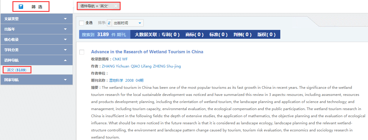 筛选的作用同样为进一步限定检索条件,使检索结果更加符合要求。期刊概览筛选区设置了6个筛选词,分别为文献类型、出版年、核心收录、学科分类、语种导航、国家导航。点击具体的筛选词,阅览区显示筛选后的结果,筛选词与之前的检索词之间默认AND关系。点击