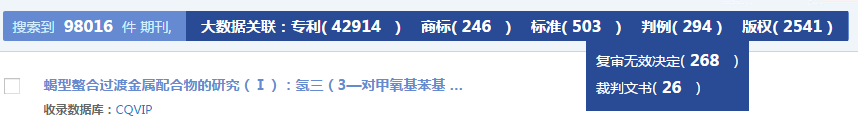 阅览区显示大数据关联信息及期刊检索结果,大数据关联信息为系统以相应的检索表达式检索得出,点击具体数据可跳转至相应概览页面,点击