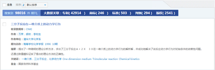 期刊检索结果展示的是题录信息,包括收录数据库、作者、作者单位、期刊名称、摘要、关键词及基金,用户根据出版时间、系统评分、文章页数可对检索结果进行排序。
