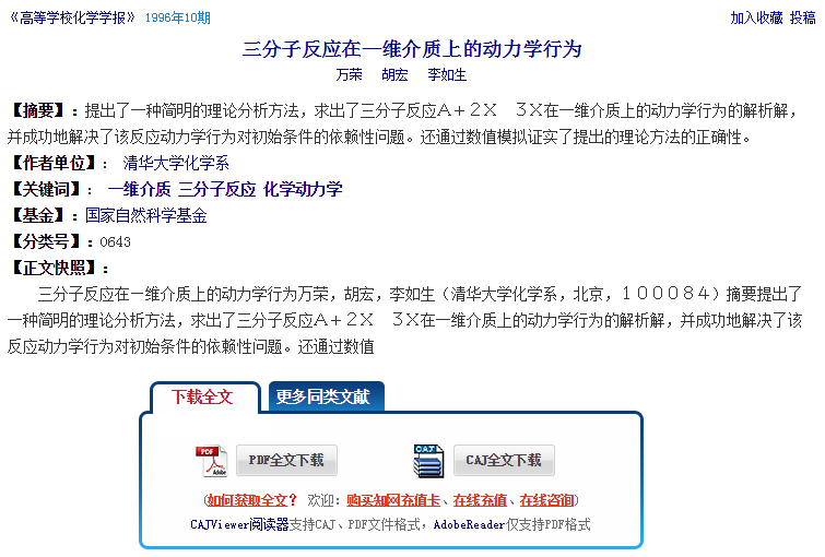 点击文章名称可进入期刊细览页面,点击作者、作者单位、期刊名称或关键词,系统将以新的检索表达式进行检索,例如以作者 = '万荣'、作者单位 = '清华大学室化学系'、文献来源原文 = '高等学校化学学报' and 出版年 = '1996' and ISS = '10'、关键词 = '一维介质'进行检索。点击数据库跳转至下图所示外链接页面。