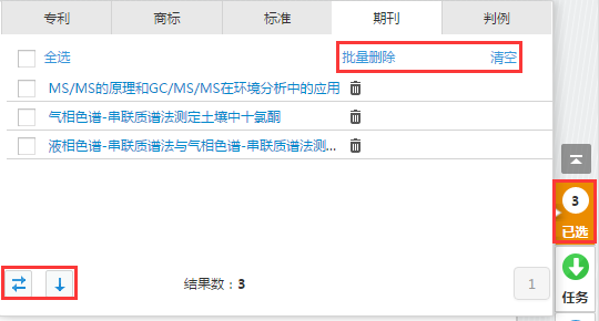右侧工具栏包括已选、任务、工具及反馈。在“已选-期刊”项下,用户可对加入已选的期刊进行对比分析、下载及删除。