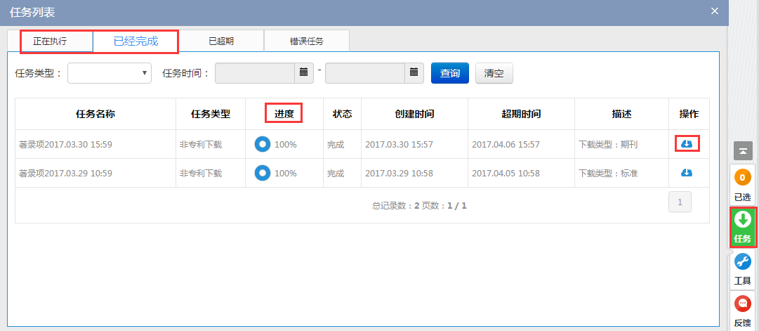 提交的下载任务可在“任务-正在执行”项下查看下载进度,已完成的任务需点击
