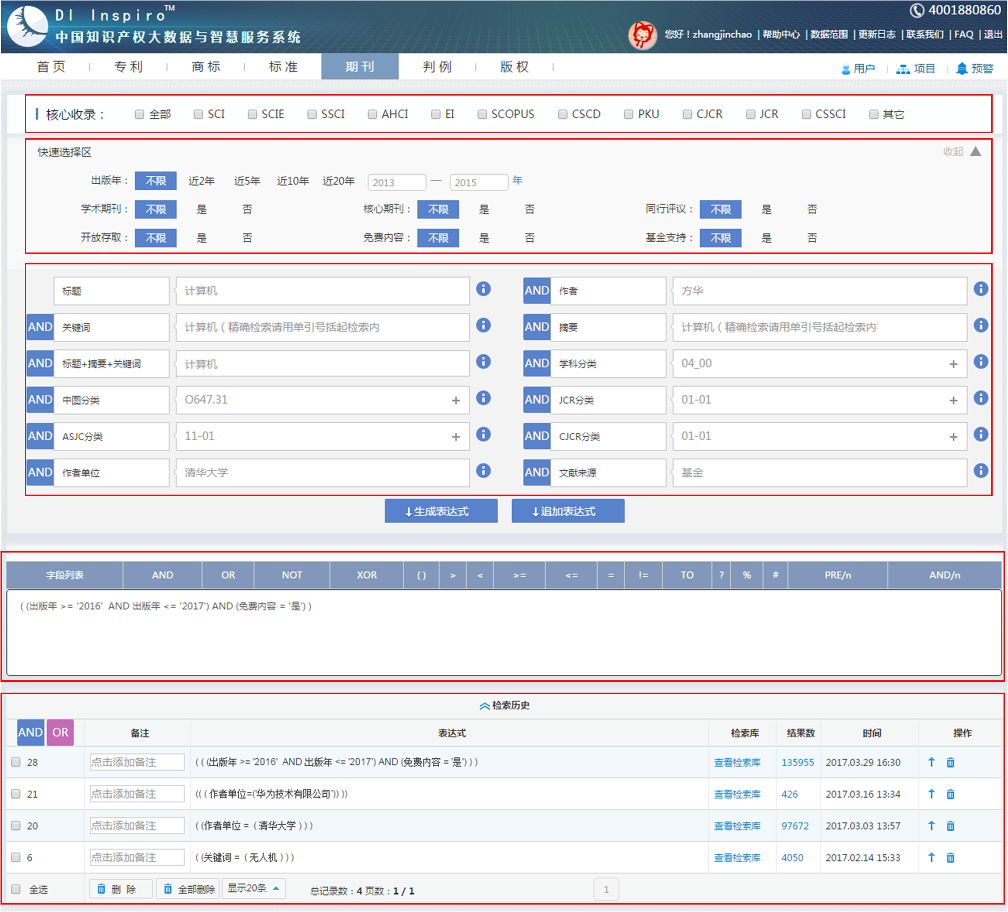,即可进入期刊检索页面,期刊检索页面从上至下依次为数据库选择区、快速选择区、表格检索区、表达式编辑区和检索历史显示区。