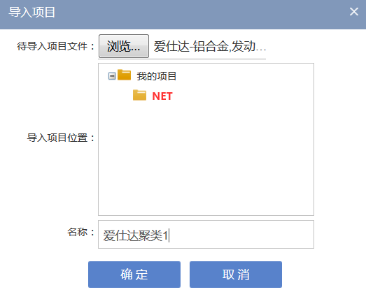 ,弹出导入项目对话框。在待导入项目文件处浏览选中存放TXT文件的位置,在导入项目位置选择想要导入的项目夹,在名称处给项目命名,点击